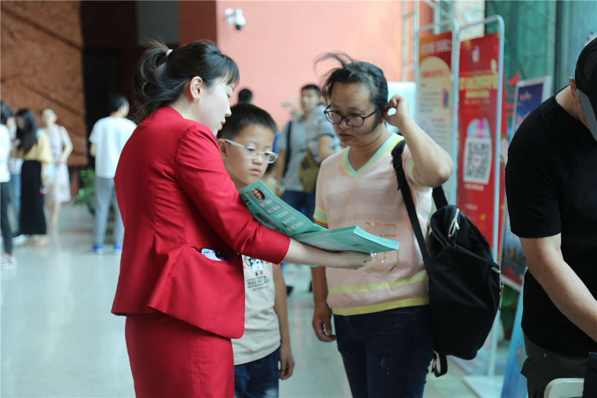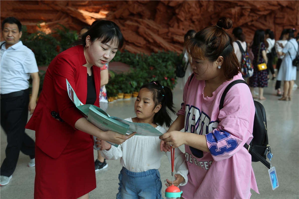 孩子们在家长的带领下到服务台领取青少年参观导览手册