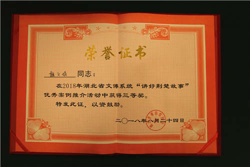 2018年8月24日,我馆志愿者魏文娟参加全省“讲好荆楚故事”优秀案例推介活动,喜获三等奖。