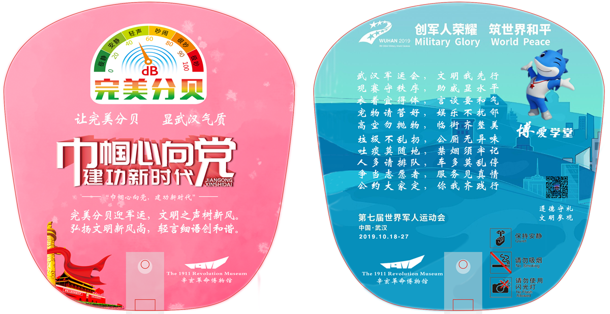 活动宣传扇一面为“完美分贝”、一面为“军运会”文明公约宣传语