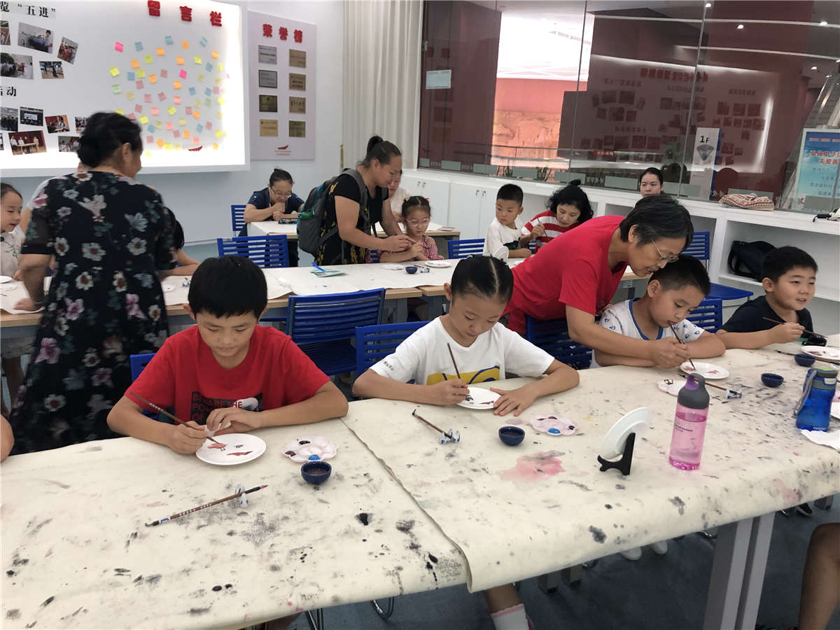 活动最后,我们选取齐白石画作中的小船、树、山作为素材,带领参与活动的亲子家庭在各自的瓷盘上描绘出属于自己的中秋望月!