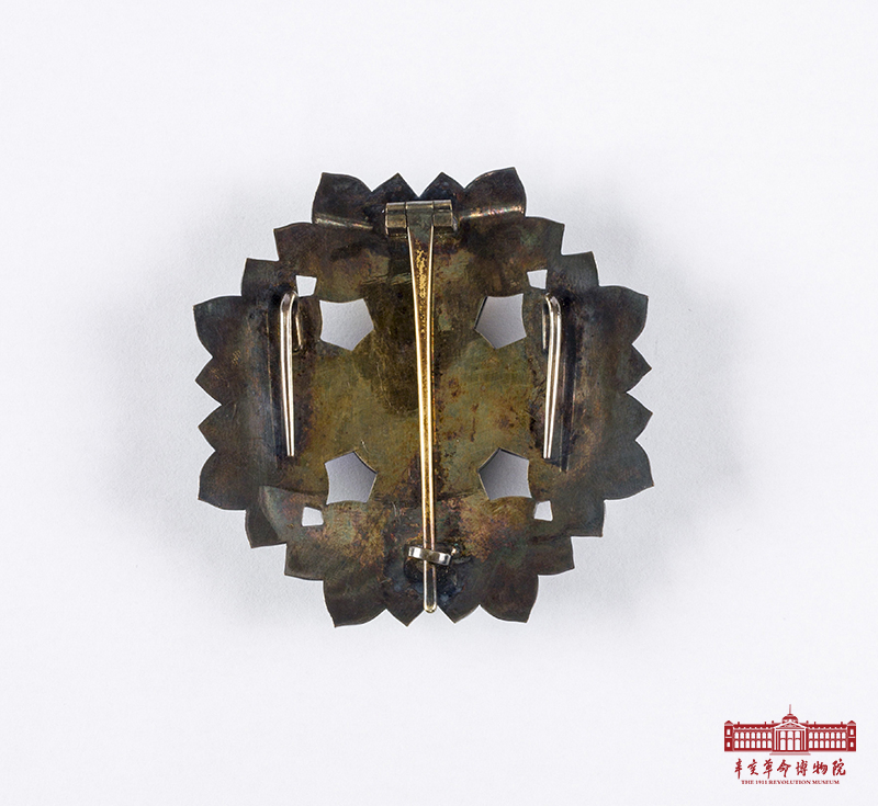 熊秉坤勋五位章,银胎景泰蓝徽章,星形。主图案分三层,从内到外依次为:最内层为圆形,红底嵌珠,珠四周饰叶穗;中间层辅以四轮,分别饰黄、白、蓝、黑色珐琅,金色轮边,黄、黑二轮上各嵌一珠,二珠以表示勋五位等级;最外层为八片绿色的牡丹花叶纹饰,叶茎为银色,衬于四轮之下。背面以别针佩挂。配脱胎黑漆盒,盒面篆书“勋五位章”。