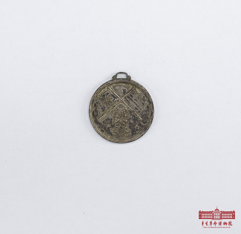 湖北都督府办公证,民初机制冲压徽章,圆形。正面上部为五色旗和铁血十八星旗交叉图案,旗下阳镌楷书“办公证”三字,背面冲压楷书“湖北都督府”和“第 号”字样,两段之间以花带分隔,阴刻编号“肆壹”于“第 号”之间,顶部有链环。