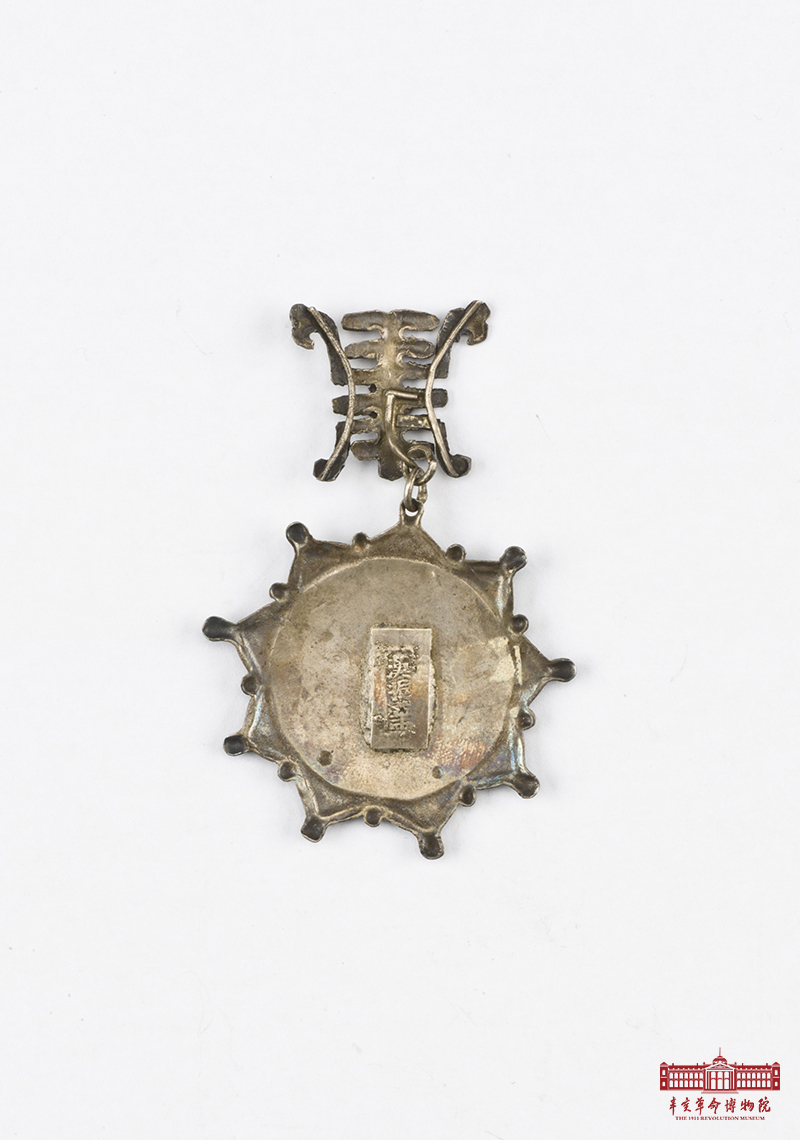 黎元洪奖鄂军教导团武功银章,1912年制造,机器冲压制胸章。银质,九角星形。徽章为变形的十八星旗图案,正中圆版镌“鄂军教导团武功”,四周自右向左环以楷书“中华民国副总统黎元洪奖”字样,下方饰两颗五角星。徽章上方有 “寿”字图案挂钩,挂钩与徽章之间以饰链相连。徽章背面硬印“汉振华”银号名。
