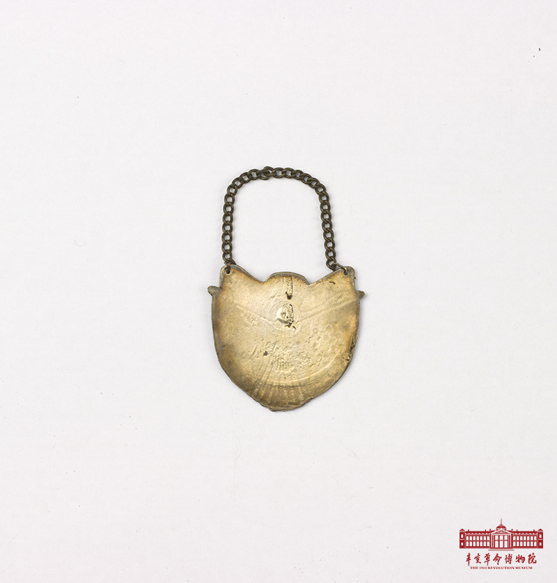 中华民国元年纪念章,民初银胎仿珐琅彩徽章,心形。徽章顶部两侧有环,穿侧身链。徽章正面上端为彩带状,自右向左楷书镌刻“中华民国元年”字样,带下为悬垂的两面旗帜,一边为五色旗,一边为十八星旗。背面正中上方印“长新”银号名称以及“纹银”质地。