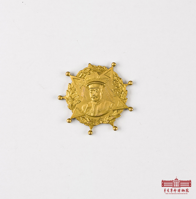 黎元洪赠武汉纪念章,民初珐琅金属胸章,金色,星形。纪念章为1912年10月民元国庆之际所颁,正面正中白底圆版,饰五色旗和十八星旗交叉图案,其外一周镌“武汉纪念章”字样;背面正中为黎元洪戎装浮雕胸像,像上方镌黎元洪英文姓名,左下方标注大写英文“GOLD PLATE”(镀金)字样。整枚纪念章为十八星图案,四缘浮雕以三层橄榄叶。