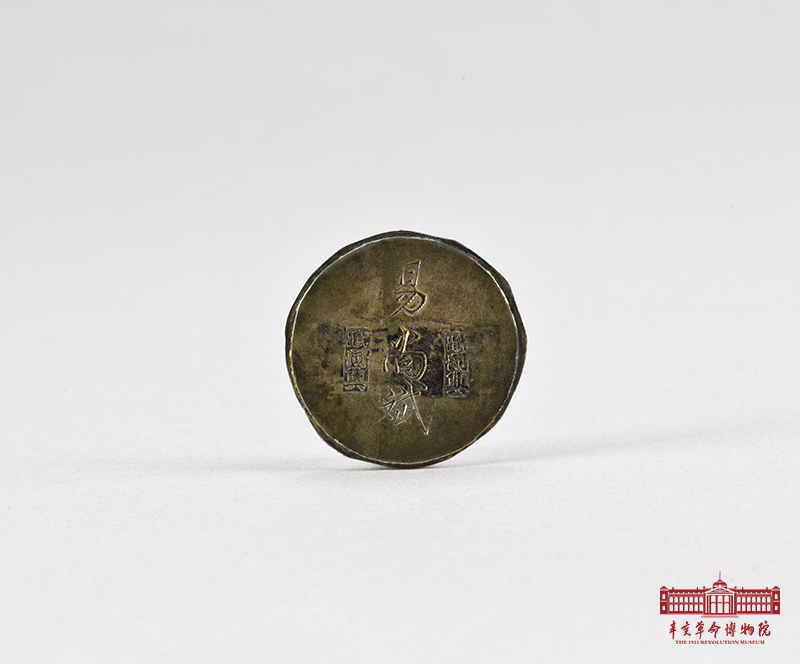 易尚斌铁血将校退伍纪章 ,1912年制造,机制冲压徽章,圆形。徽章正面居中为铁血十八星旗与五色国旗交叉图案,交叉处竖书楷体“铁血将校”,其上横书楷体“鄂军政府”,其下横书楷体“退伍纪念”字样。徽章文字图案均为浮凸样式。背面正中阴刻所有者“易尚斌”,两侧硬印“武昌同兴”银号戳记。