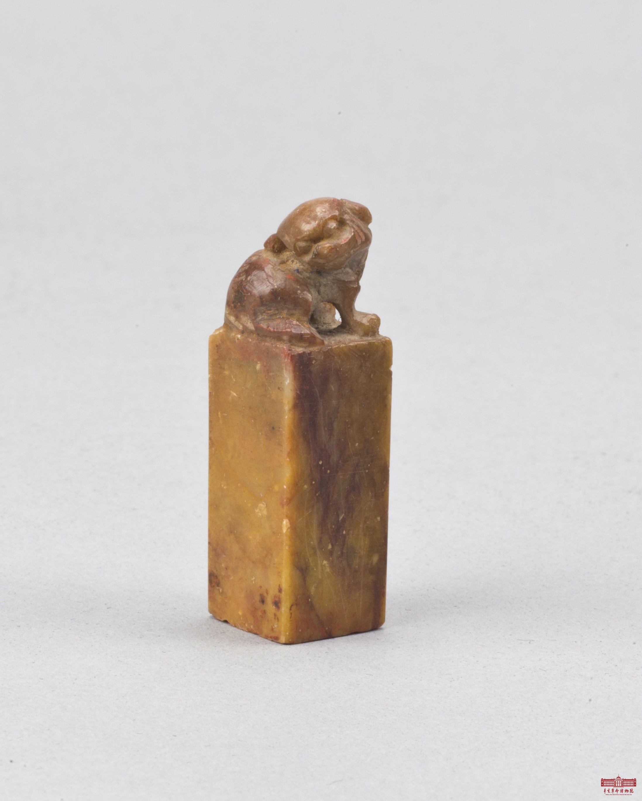 方体,通体为黄间红色,貔貅钮。印面篆书