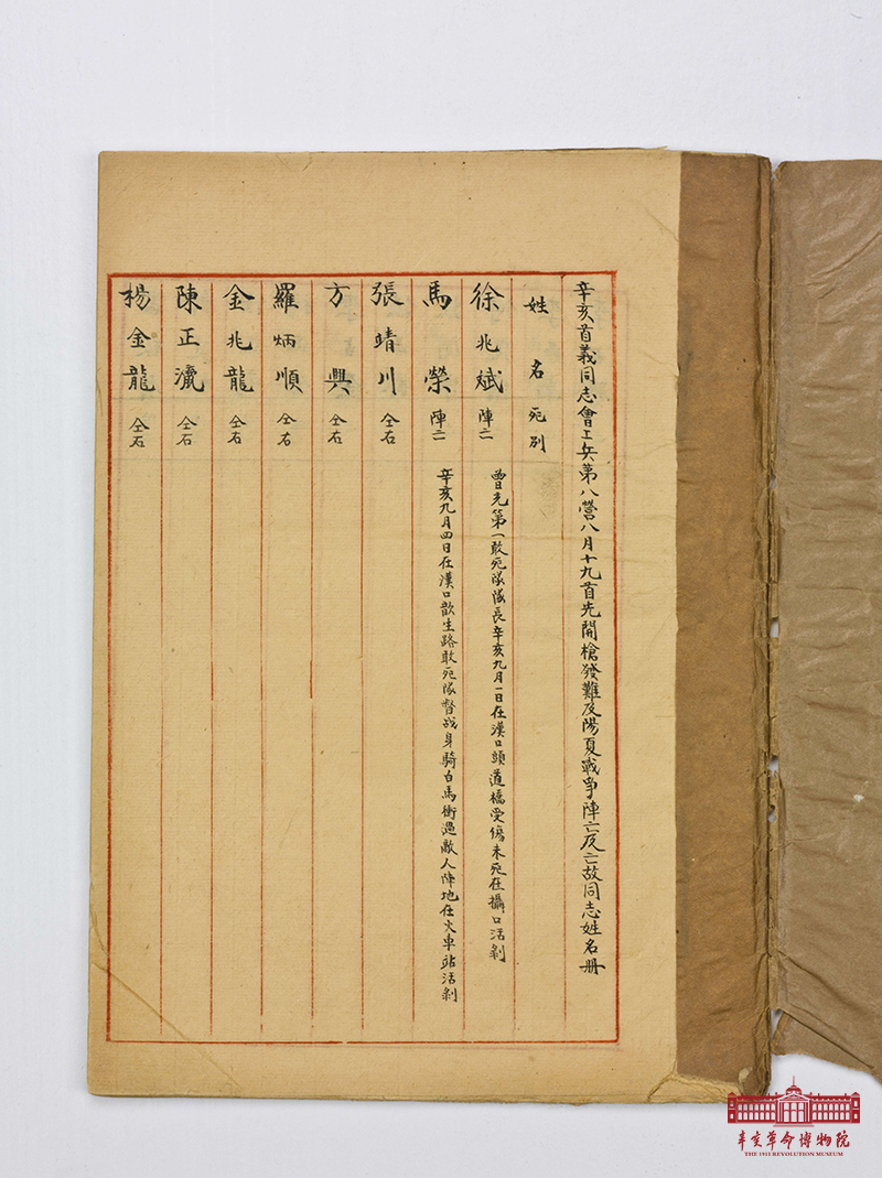 辛亥首义同志会工兵第八营八月十九首先开枪发难及阳夏战争阵亡及亡故同志姓名册,所录人名共计337名,为工兵八营10月10日晚首先开枪发难及在阳夏战争阵亡及亡故同志的姓名、死别(战争中阵亡的以及至统计时已亡故的),有特殊事迹的人物在死别下方标明。