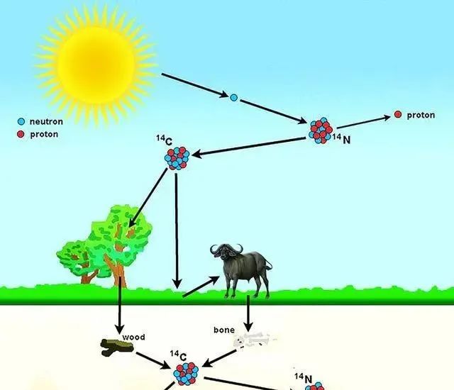 在大气层中,碳14主要是由氮14被宇宙射线(即一个中子)撞击掉一个质子产生的,由于宇宙射线的大小在千万年都保持不变,所以在大气层中的碳14和碳12之比例是长期保持不变的。动物和植物通过呼吸能够让体内的碳14和碳12之比例与大气中比例保持一样,但是当动物和植物死后,体内的碳14会发生衰变而减少,而碳12却保持不变,所以随着时间的流逝,动物和植物体内的碳14和碳12之比例会不断减少。那么我们就可以根据这个比例减少的多少计算出动物和植物已经死亡了多久。所以就可以通过三星堆中文物的碳14进行测量,得到文物属于哪个年代。