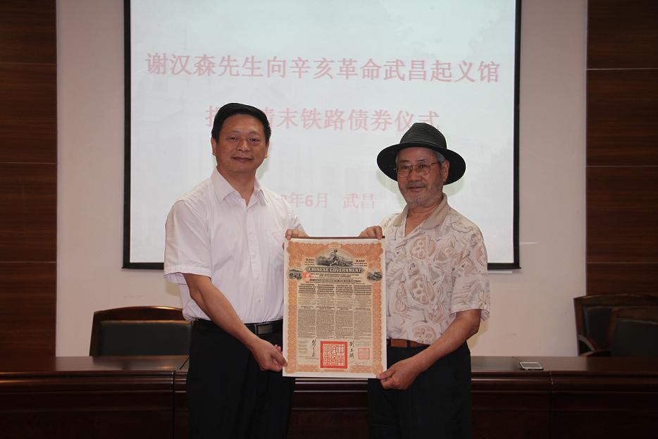 谢汉森,广东人,上世纪60年代远渡英国,80年代从事近代债券的收藏工作。此次是谢先生第二次赴汉向我馆捐赠。据介绍,这批债券是其陆续从伦敦拍卖行购得,其中,既有外国驻华银行发行的债券,又有民国政府发行的铁路债券和救国公债债券。这些债券既是社会金融和铁路建设的物证,也是研究近代中国经济发展和工业化进程的重要文献资料。