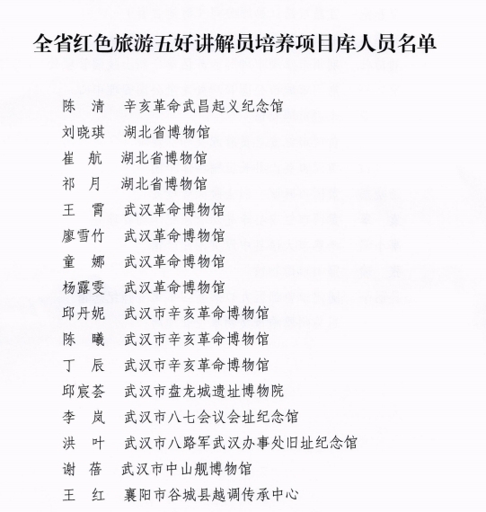 9月18日,2021湖北省红色旅游“双十佳”(十佳红色旅游经典景区、十佳红色旅游讲解员)评选活动成果展示暨“红色足迹遍荆楚”宣传活动启动仪式在武汉举办,我馆入选“灵秀湖北·十佳红色旅游经典景区”,我馆讲解员陈清入选全省红色旅游五好讲解员培养项目库。此前,我馆已于2017年入选全国红色旅游经典景区名录。