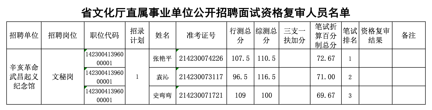 湖北省省直事业单位2018年公开招聘笔试已结束,根据省人社厅、省文化厅要求,我单位将于2018年7月13日对笔试入围考生进行面试资格复审,现将相关事项通知如下: