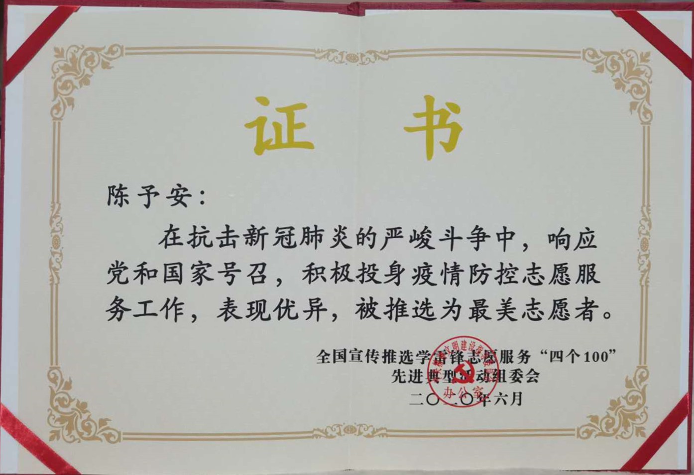 志愿服务期间,陈予安同志不惧危险、不计回报,用挚诚的初心、无私的行动为社区600余人次提供了服务,行驶里程近30000公里,得到了社区党组织和群众的交口称赞和感激,还与其车队队友一起被阿里巴巴集团授予“2020年武汉新冠肺炎疫情志愿者行动特别奖章”。
