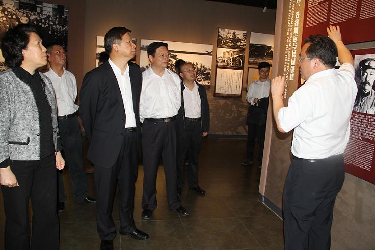 参观首先从武昌起义军政府旧址主楼的复原陈列开始。参观完主楼后,还参观了布置于西配楼和议员公所的《红楼鸟瞰》、《为天下先——辛亥革命史迹陈列》两个陈列展览。在一个多小时的参观过程中,宋部长一行对我馆史迹陈列展览表现出浓厚的兴趣,在认真听取讲解员讲解的同时,还不时与陪同参观的馆领导进行交流,并就我馆加强旧址文物保护和青少年革命传统和历史知识教育、传承发扬“敢为天下先”的辛亥首义精神、加强海峡两岸文化交流等工作给予了充分的肯定。