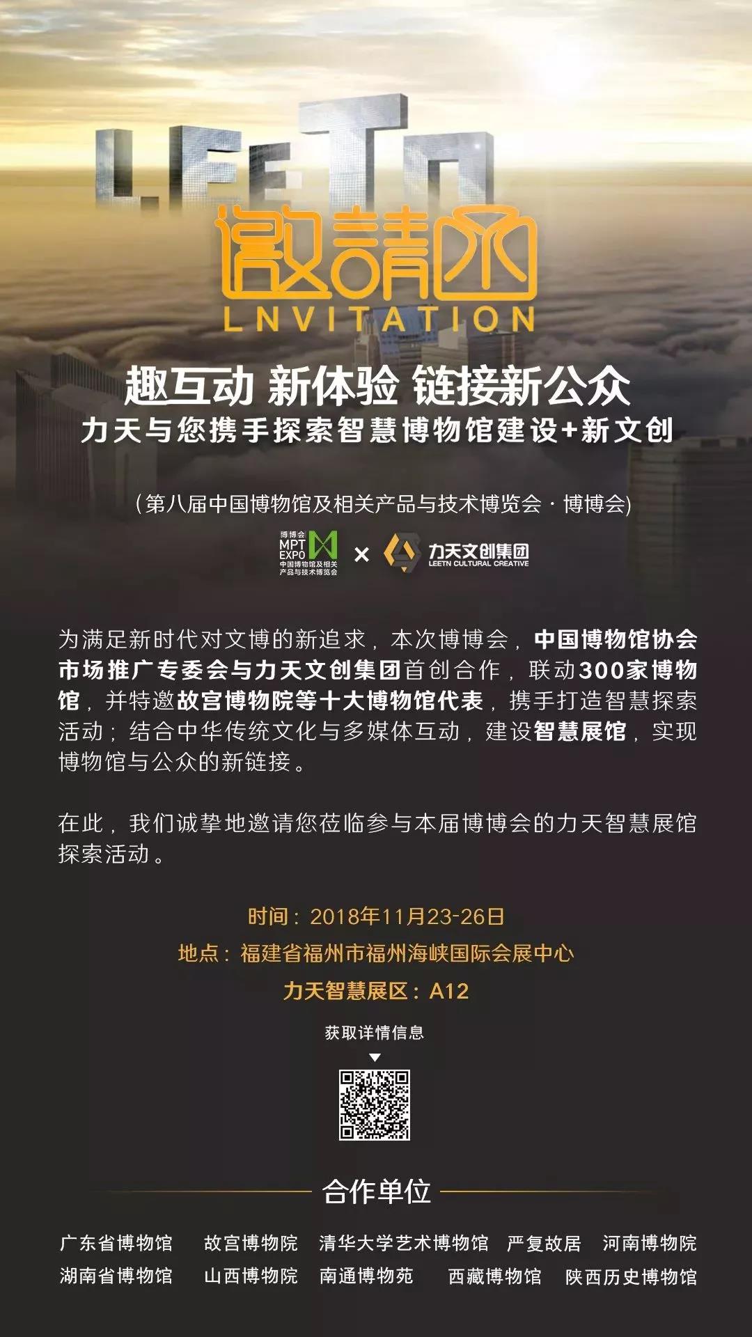 第八届中国博物馆及相关产品与技术博览会(简称“博博会”)将于2018年11月23至26日于福州举办,会议以“博物馆:新时代? 新征程” 为主题,由博物馆展示、文博企业展示、公益服务平台和公众文化互动空间四大板块构成。