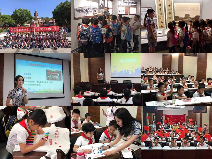 在我馆讲解员老师的带领下,同学们分三队参观了我馆《为天下先——辛亥革命武昌起义史迹陈列》展览,了解了敢为天下先的首义精神。随后,在学术报告厅,我馆社教老师章旖,从城市发展、生态环境、创新成果、风俗人情等方面,向同学们介绍了湖北省情及武汉市情,用详细的数据和开阔的视野,带领同学们了解多彩的湖北和每天不一样的大武汉,让同学们对湖北、对武汉的历史、文化、风俗、美食、传统等方面知识如数家珍。代文君老师从“什么是军运会”、“军运会的前世”、“军运会有哪些赛事”、“我能为军运会做什么”等方面为同学们介绍了军运会的相关知识,让每位同学都能成为军运会的小“东道主”。课程结束后,同学们在印有我馆logo的空白文化衫上绘制了军运会相关元素的图案,有画吉祥物“兵兵”的,有画国旗的,还有写口号的……内容丰富又有创意。他们穿上文化衫,戴好红领巾,挥舞着小国旗,齐唱《歌唱祖国》,为祖国庆生,为军运会加油