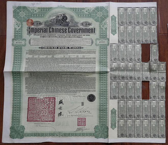 此次捐赠的债券大部分为铁路借款债券。其中,几件盛宣怀签字、面值20~100英镑不等的“湖广铁路偿债金券”,佐证了清政府假铁路国有之名,将已归民间所有的川汉、粤汉铁路筑路权收归“国有”,却立刻与美、英、法、德四国银行团订立借款合同,出卖川汉、粤汉铁路修筑权,从而引发了“保路运动”风潮的历史事件。几件熊希龄、刘镜人等签署的“五厘善后金券”,使民国初年有名的“善后大借款”这一历史事件,有了最真切的实物见证。