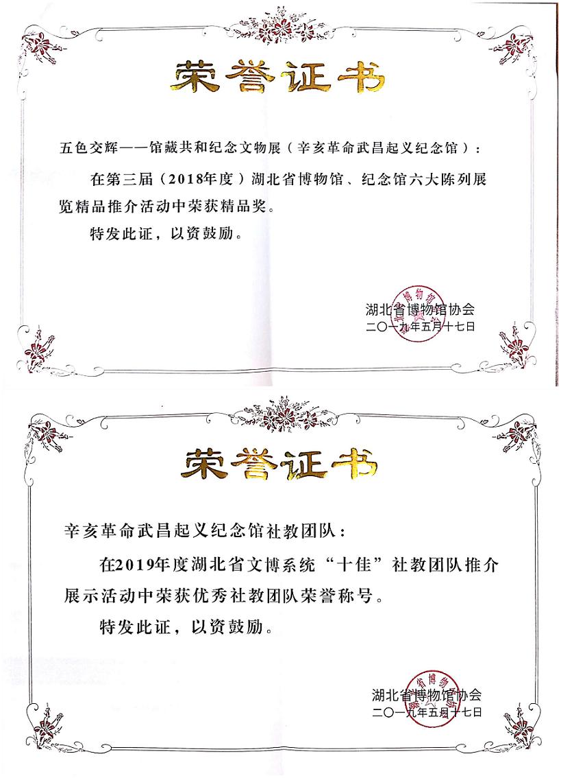 5月17日,湖北省博物馆协会在湖北省博物馆主办的国际博物馆日活动中,揭晓了“第三届(2018年度)湖北省博物馆、纪念馆六大陈列展览精品推介活动”、“2019年度湖北省文博系统‘十佳’社教团队推介展示活动”、“2019湖北省博物馆文创产品设计方案征集”获奖名单。其中,我馆的专题展览《五色交辉——馆藏共和纪念文物展》荣获六大陈列展览精品奖,我馆社教团队荣获“优秀社教团队”荣誉称号。