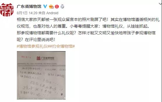 对此,广东省博物馆作出回应:在博物馆遵循相关的礼仪规范,也是对他人的尊重。博物馆礼仪,从娃娃抓起