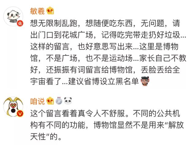 博物馆工作人员“管得好多啊”“不让孩子解放天性吗?”“跑怎么了跳怎么了?碰恐龙又怎么了......”并且反问:“观众不是上帝吗?孩子就不是吗?管得也太多了吧!”