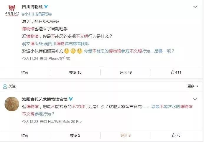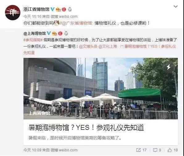 如近日四川博物院、洛阳古代艺术博物馆发起“最不能忍的博物馆管参观不文明行为”投票,网友纷纷留言点赞;上海博物馆发布微博文章《暑假泡博物馆?YES!参观礼仪先知道》,多家博物馆转发,观众文明参观成为微博热门话题。