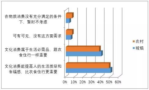 调查显示,城镇居民对文化消费的需求程度更高,认为文化消费等同于生活必需品甚至比衣食住行更重要的占比达到九成。相比之下,认为文化需求可有可无甚至暂时不考虑的农村居民比重更高。