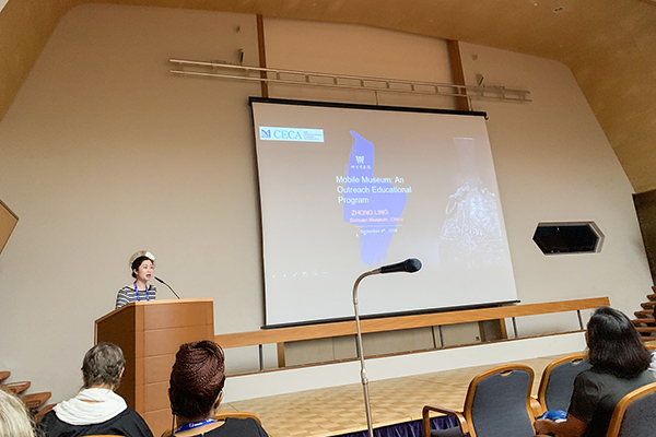 四川博物院钟玲发表《延伸与拓展的博物馆教育项目》主题演讲。发言紧紧围绕四川山区和少数民族地区等博物馆发展相对滞后的状况,阐述了2010年四川博物院创办中国第一辆“大篷车流动博物馆”,带展览、教育活动、非遗艺术演出和技艺展示到三区两基层,2016年四川博物院与四川省电化教育馆合作建立四川省文博教育平台,整合四川省240多座博物馆的文物和课程资源,建设文博试点学校,开展文博课程赛的教育项目实践情况,扎实推动文博远程教育在全省博物馆文化欠发达地区的均衡性、平等性发展。