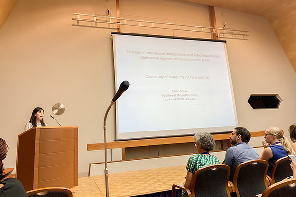 西南民族大学博物馆陈蜀西发表《博物馆教育阐释及其对公众关系之影响—中国与英国博物馆案例分析》主题演讲。他结合在中国及英国博物馆的工作实习经历,对两国在博物馆教育阐释的理念和路径等方面作了基于比较研究的陈述。阐释在教育作为当今博物馆突出职能的语境下,博物馆成为沟通教育资源与博物馆观众的重要桥梁。