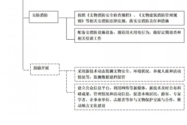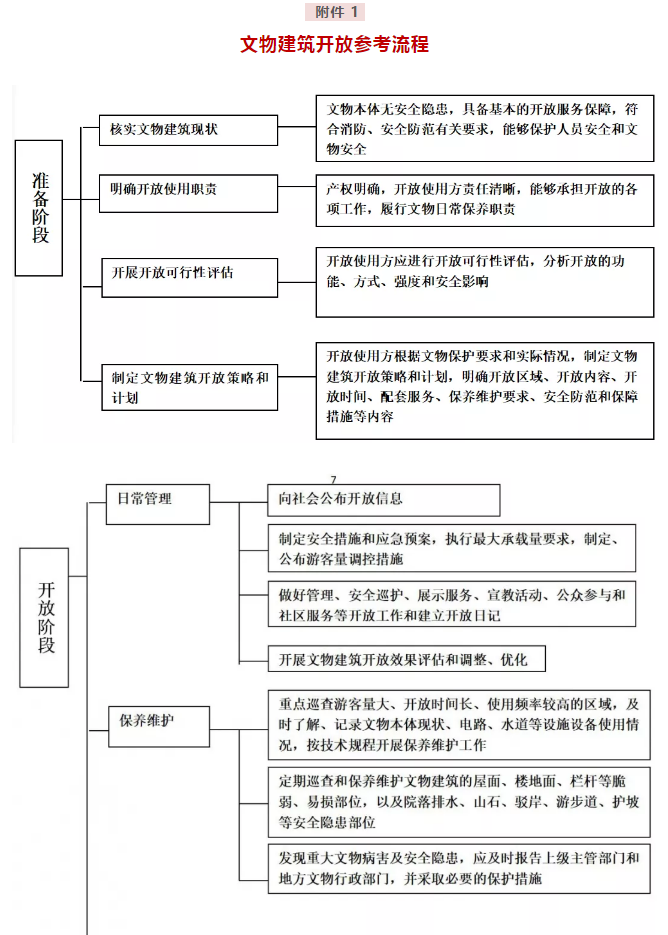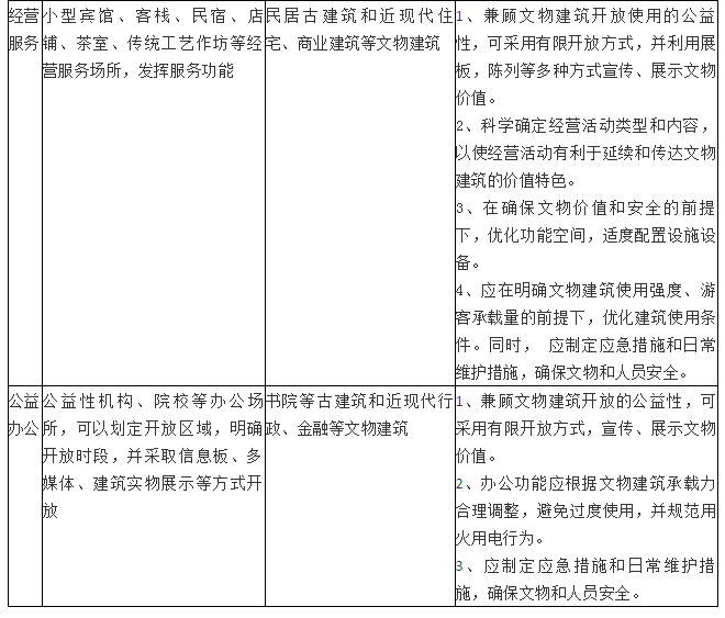 (一)应合理控制开放使用范围、内容和强度,修缮过程中应充分考虑开放使用,避免二次装修、空间改造、设施设备装配影响文物安全。